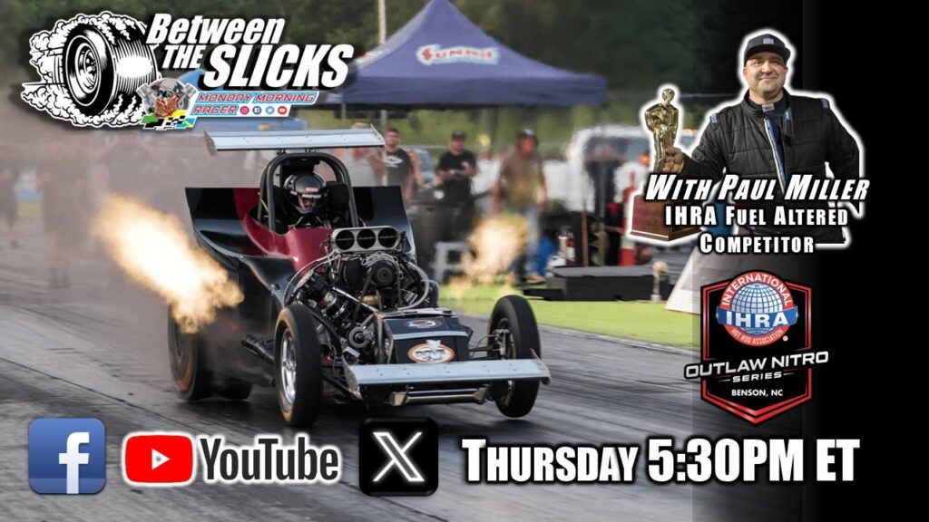 It's DRAG RACING news and talk on Between The Slicks! LIVE at 5:30PM ET (4/23) the Monday Morning Racer will be LIVE with the news from various sanctioning bodies like Southeast Gassers, IHRA, NHRA and more in the world of drag racing. The IHRA Nitro Outlaw Series is well underway in its 2026 championship series. Fuel Altereds are a class and Paul Miller is in competition and winning. He is on Between The Slicks and It's all LIVE at 5:30PM ET Thursday on the Monday Morning Racer Facebook, X, or YouTube channel.